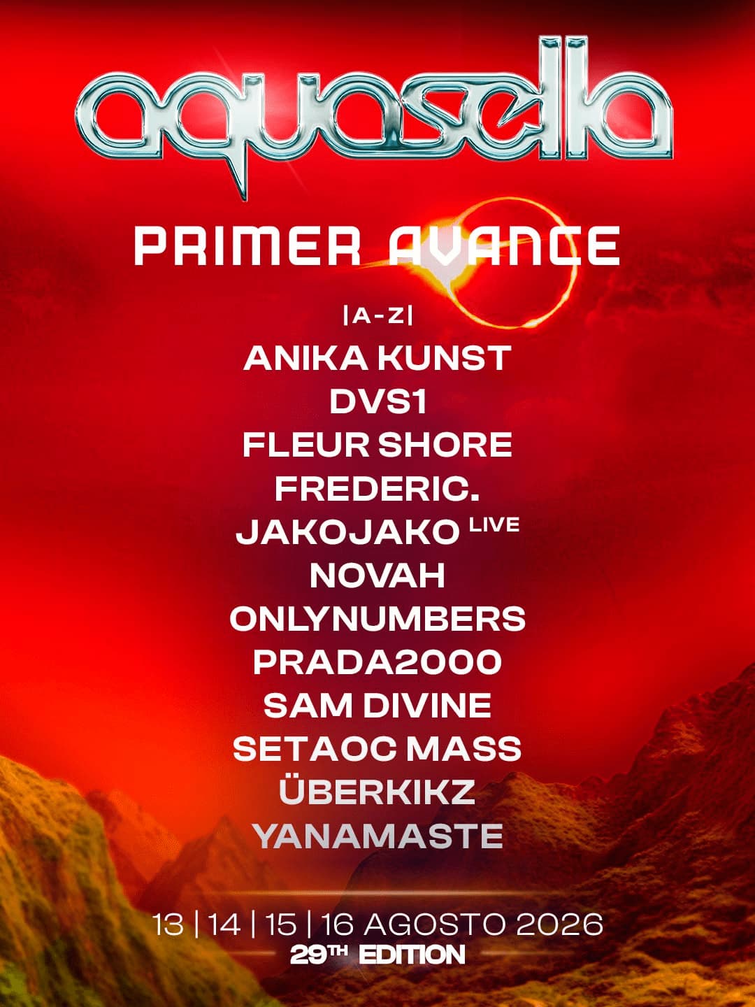 El Aquasella Festival celebrará su 29ª edición del 13 al 16 de agosto de 2026 en el emblemático Valle de la Música, entre Arriondas y Cangas de Onís, en Asturias. Este festival se ha consolidado como uno de los referentes europeos en música electrónica, especialmente en el género techno.