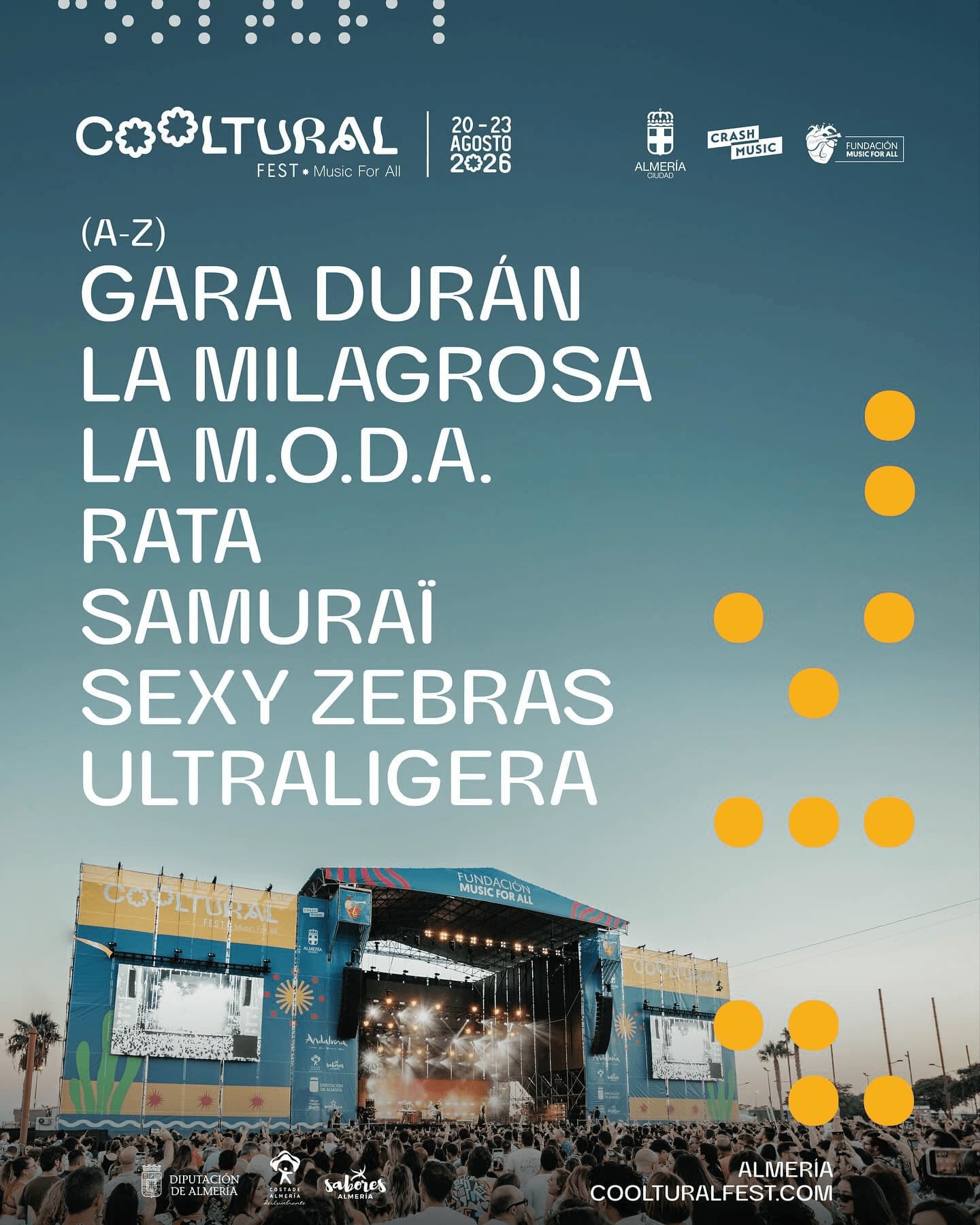 El Cooltural Fest 2026 se celebrará en agosto en el Recinto Ferial de Almería, consolidándose como uno de los festivales más destacados del verano en la ciudad. En esta octava edición, el festival contará con una destacada programación que incluye a artistas nacionales e internacionales de renombre.